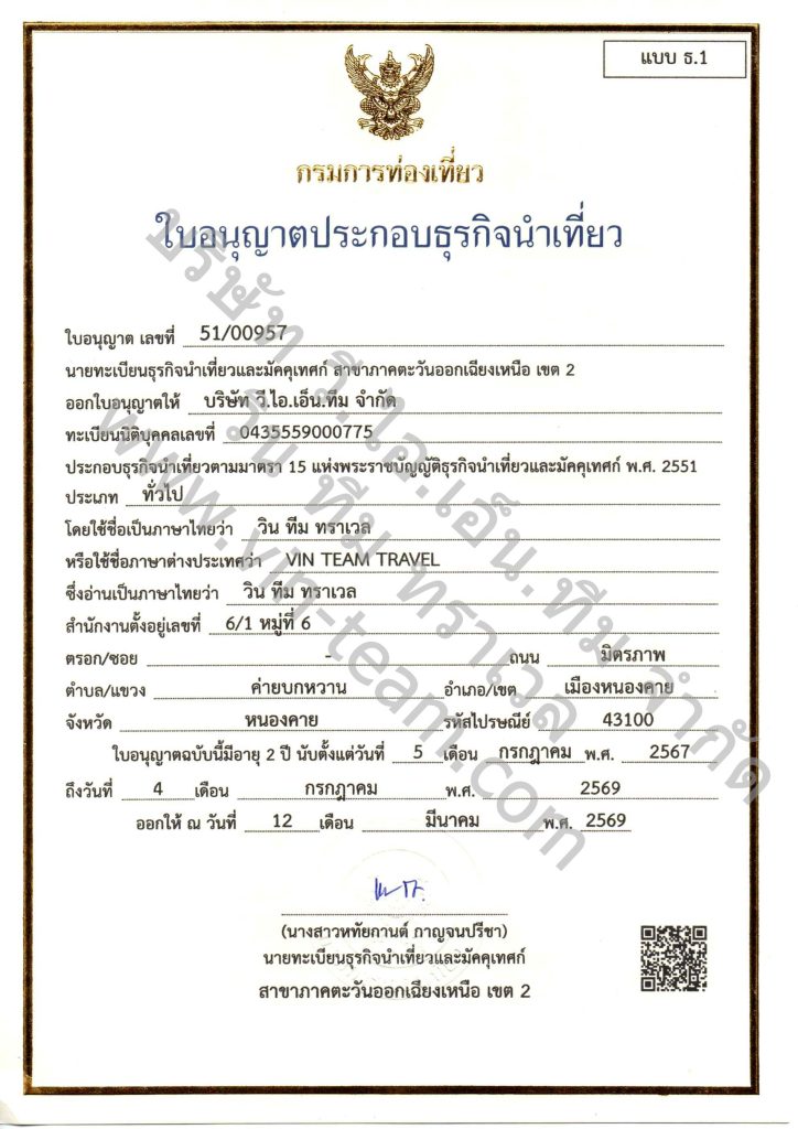 - ใบอนุญาตประกอบกิจการท่องเที่ยว เลขที่ 51/00957 จากสำนักทะเบียนธุรกิจนำเที่ยวและมัคคุเทศก์